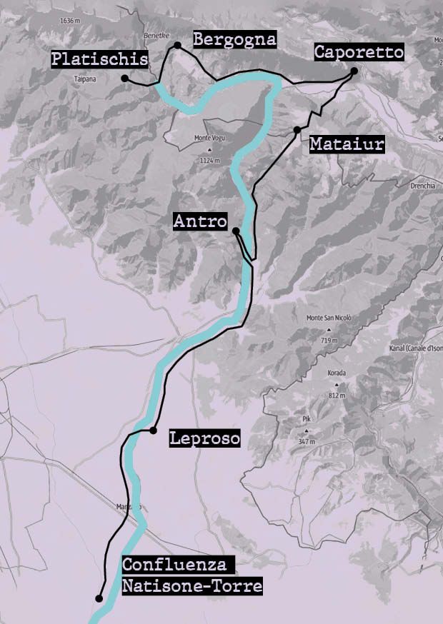 Da Breginj scenderemo di nuovo verso il Natisone fino all’antico Ponte di Napoleone. Costeggeremo il fiume sotto il Monte Mia fino a quando piega per entrare in territorio italiano, poi percorrendo la grande piana che precede arriveremo a Caporetto.